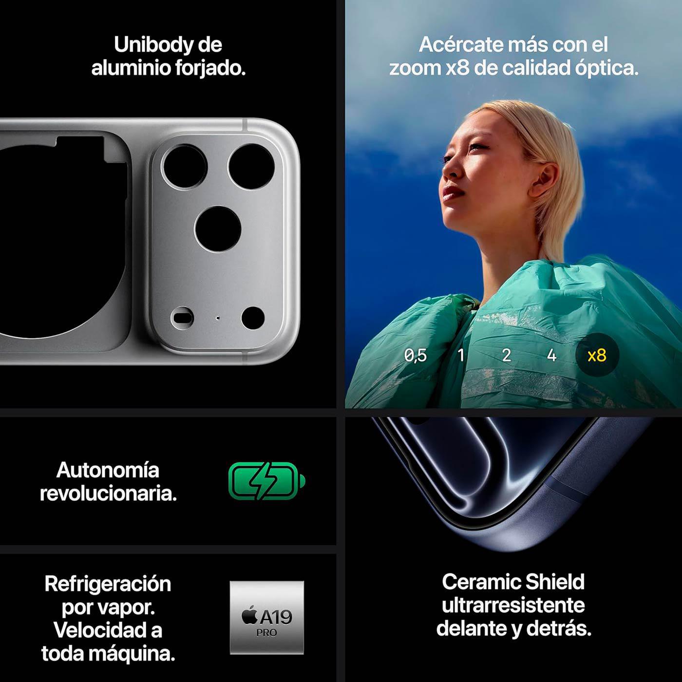 En su interior, el nuevo chip A19 Pro, con refrigeración por cámara de vapor, garantiza un rendimiento fluido incluso en tareas intensivas como juegos, edición de vídeo o realidad aumentada, y ofrece una autonomía mejorada gracias a su eficiencia energética optimizada.