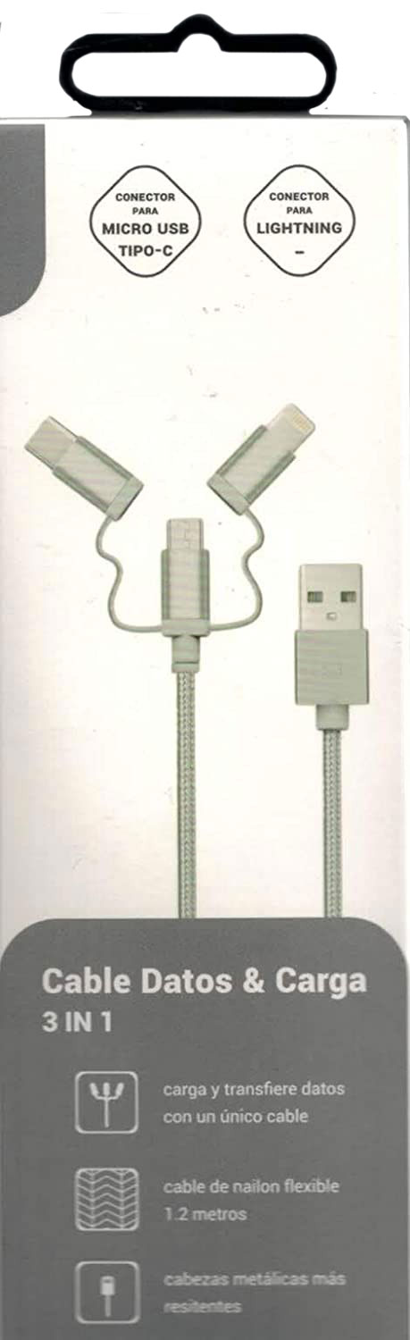 Cable de datos y carga 3 en 1. Compatible con Android y Apple. Cable resistente realizado en nylon con múltiples cabezas metálicas que permiten adaptarse a microUSB, USB Tipo C y Lightning de Apple.