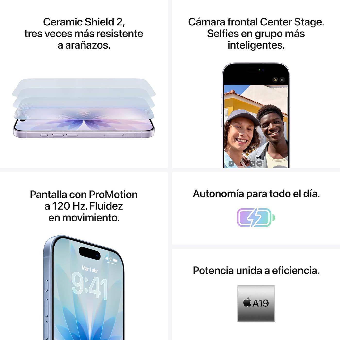 Equipado con el chip Apple A19, el iPhone 17 ofrece un rendimiento rápido y eficiente para tareas diarias, juegos, fotografía y más, junto con autonomía para todo el día.