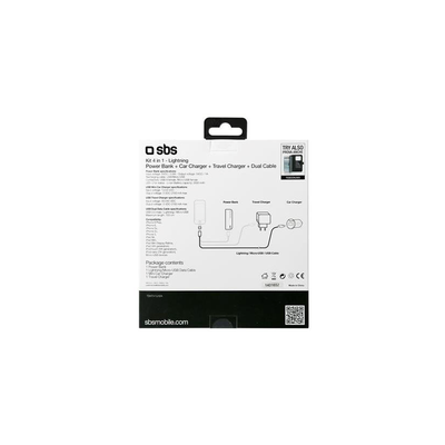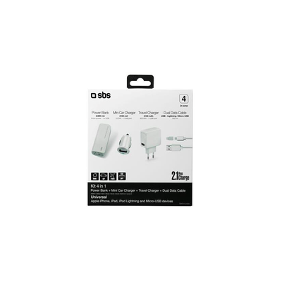 Kit alimentación 4 en 1. Cargador de red + coche + batería externa + cable dual