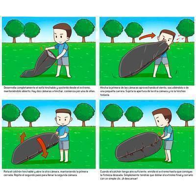 Fácil de transportar y de inflar y desinflar. El sofá hinchable se llena de aire en segundos de una forma muy fácil, sin necesidad de utilizar ningún elemento externo o bombas de inflado.